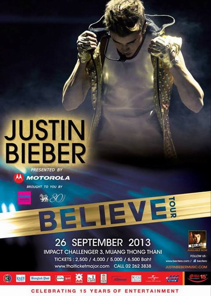 American pop hearttrob Justin Bieber is headed to bangkok. According to head official site, the Justin Bieber : Believe Tour will be roll in town on Sep 26 at Impact Arena MuangThong Thani. Thne people behind the show are none other than Thailand’s first official Bieber fan site Thaibelieber.com. Ticket price and details will be announced soon.