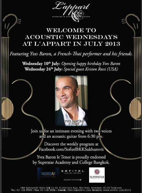 FREE!! Come to spend the time with the highly charismatic Thai-French virtuoso, Yves Baron aka Le Tenor on 10th and 24th July 2013, he will be making our L’Appart his home for unmatched special evenings. Join us for an intimate evening with two voices and an acoustic guitar, a tribute show to jazz, broadway, pop ..special guests NAD LEN (guitar) MARY KAYE (vocals) KRISTEN ROSSI (vocals )